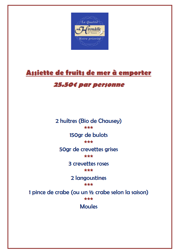 Le restaurant l'Hirondelle, avec sa cuisine régionale, ses spécialités de poissons, fruits de mer et crustacés vous régale pour vos repas d'affaires et de famille.